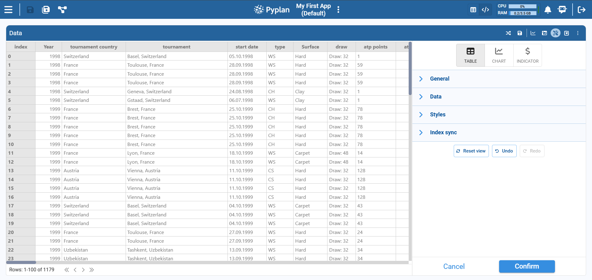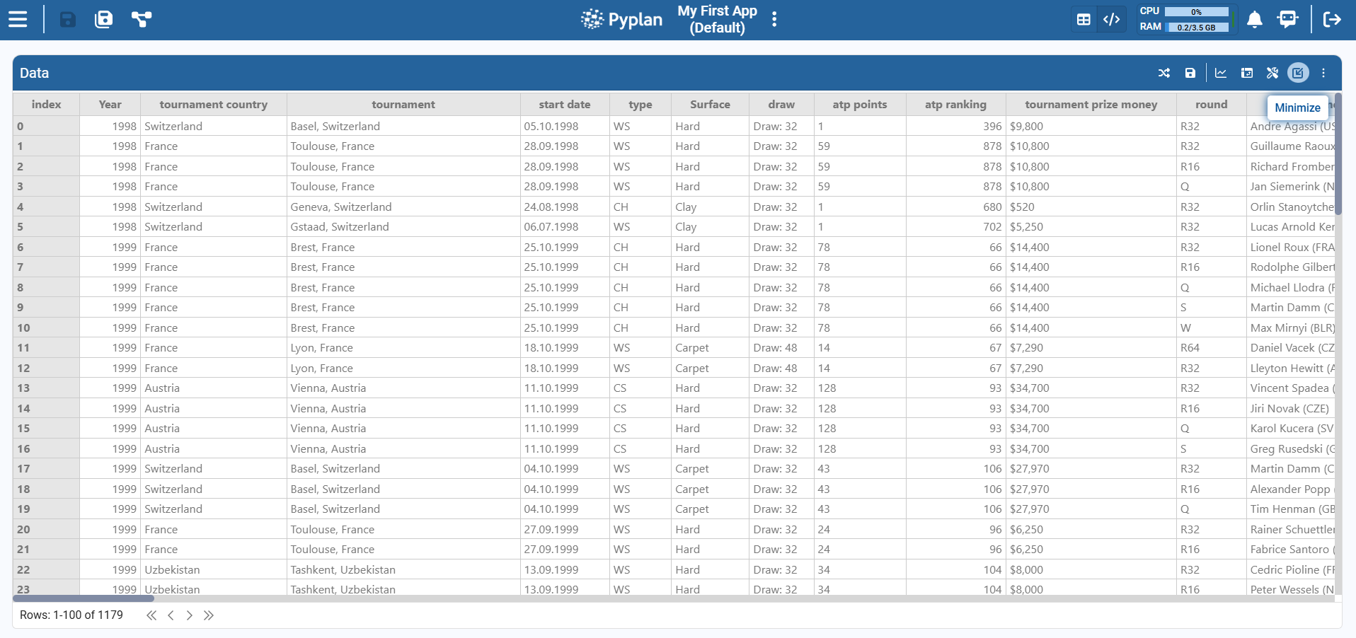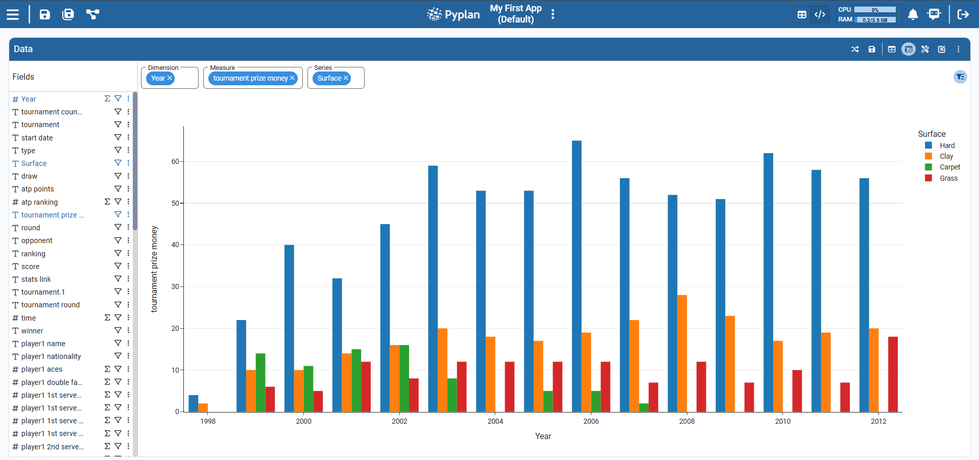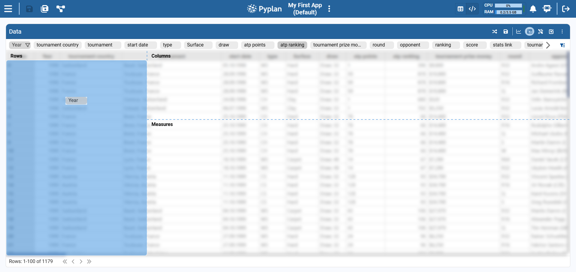 Year and tournament country are in Rows, and Surface is in Columns.winner is dragged to Measures, so the table shows the count of wins for each combination of Year, Country, and Surface.Pyplan automatically rebuilds the table according to this configuration, aggregating the selected measure(s) using the chosen function (Sum, Average, etc.) over the remaining dimensions.