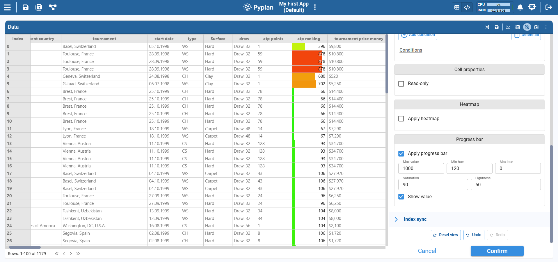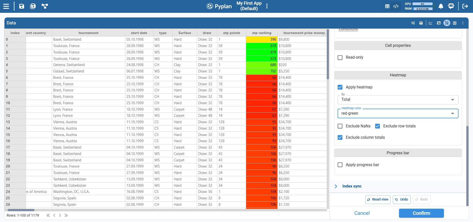 Once enabled, Pyplan automatically assigns colors based on the value range of the selected measure(s).