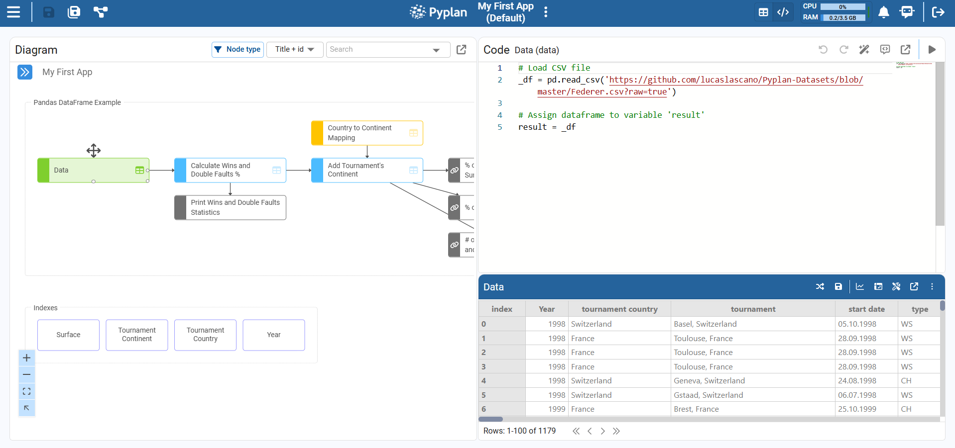 Pyplan is a no‑code / low‑code platform designed so that we can perform many data manipulation and processing tasks without writing code.