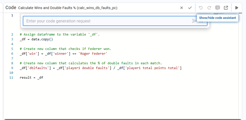 When we click the Show/hide code assistant icon in the top‑right corner of the coding window, a text bar appears above the code with the message “Enter your code generation request”.