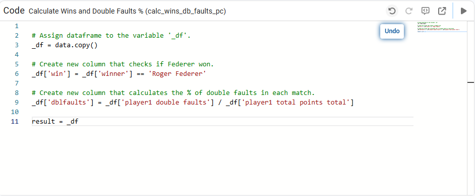 In the code definition (Code Window) you can see how two new columns “win” and “dblfaults” are created from the original Dataframe according to the following instructions: